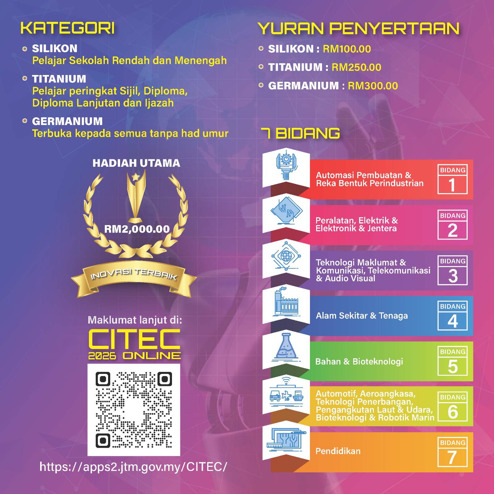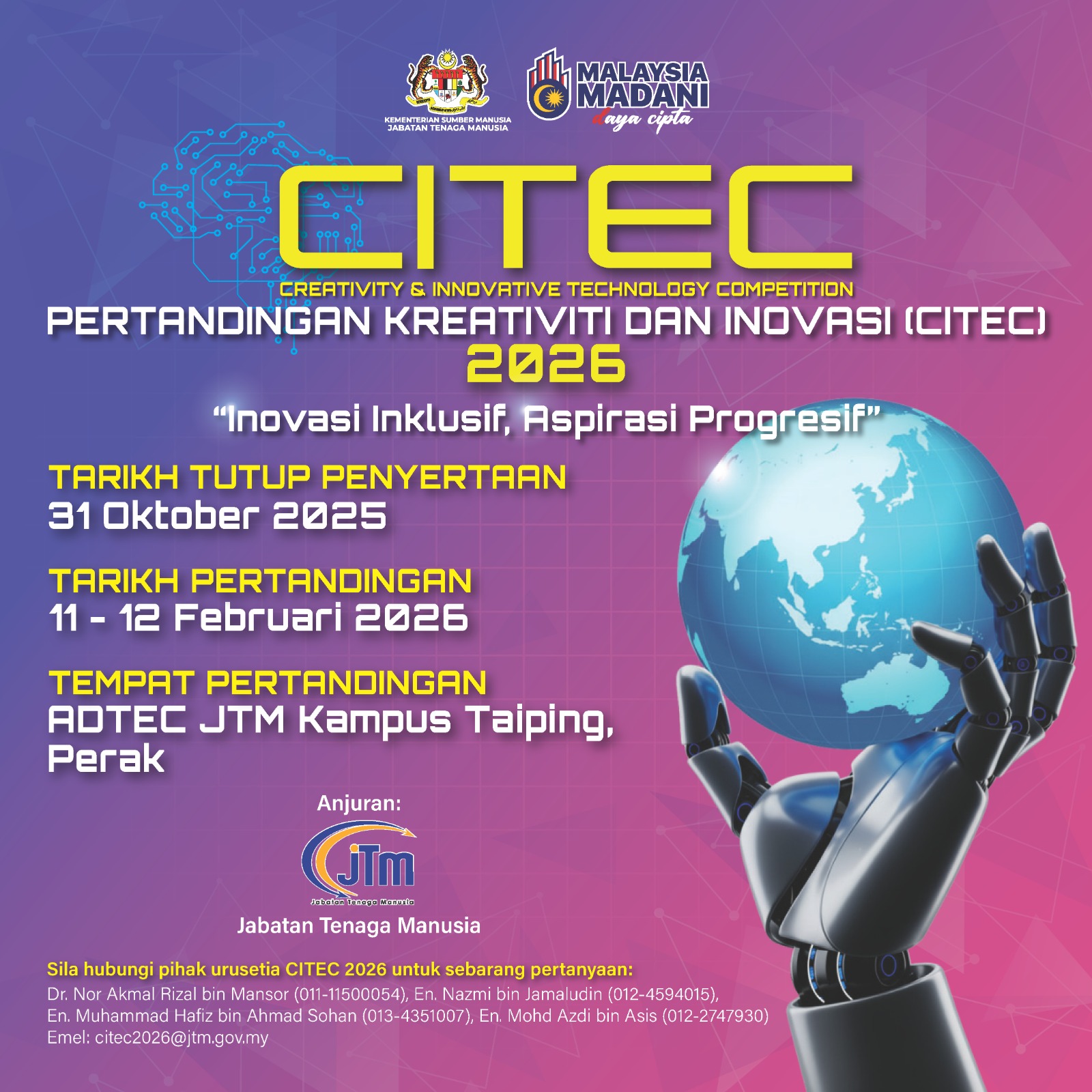 Jabatan Tenaga Manusia (JTM) dengan sukacitanya akan menganjurkan Pertandingan Kreativiti & Inovasi (CITEC) 2026 pada: